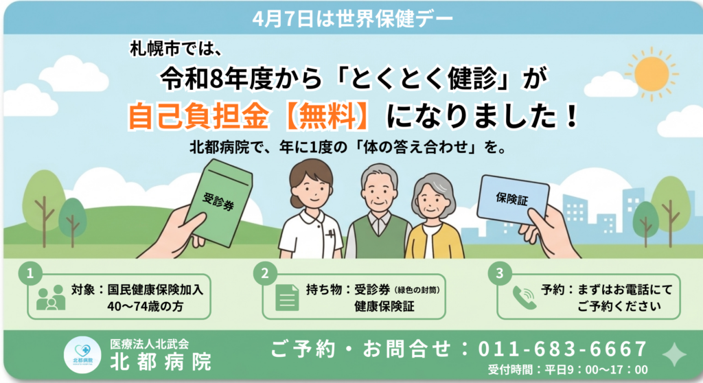 今年度(令和8年度)より、札幌市の特定健診「とくとく健診」の自己負担金が無料となりました。